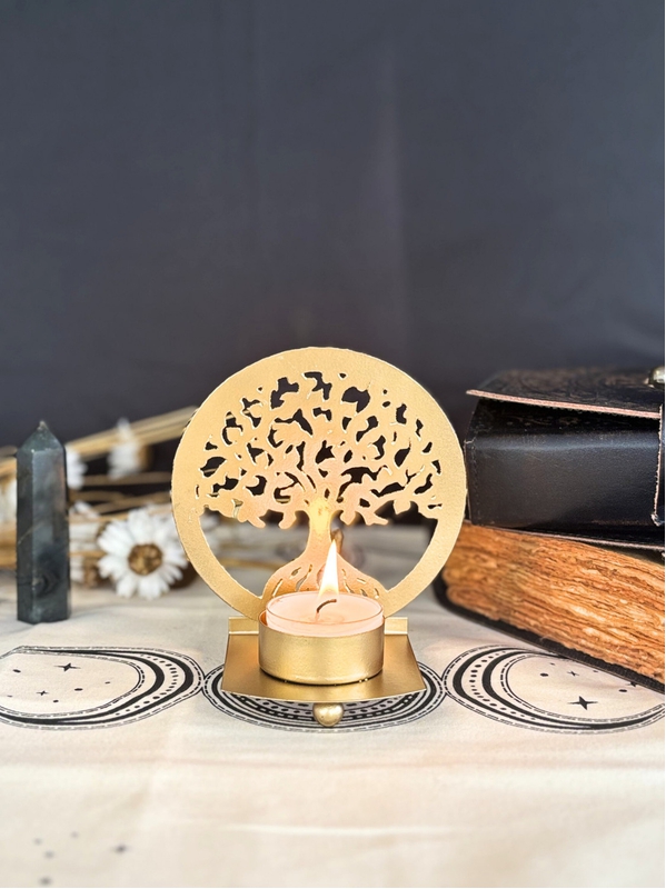 Élevez votre espace avec ce bougeoir en métal orné de l'arbre de vie. Ce symbole apporte une touche de sagesse et de connexion spirituelle tout en offrant une base stable pour vos b