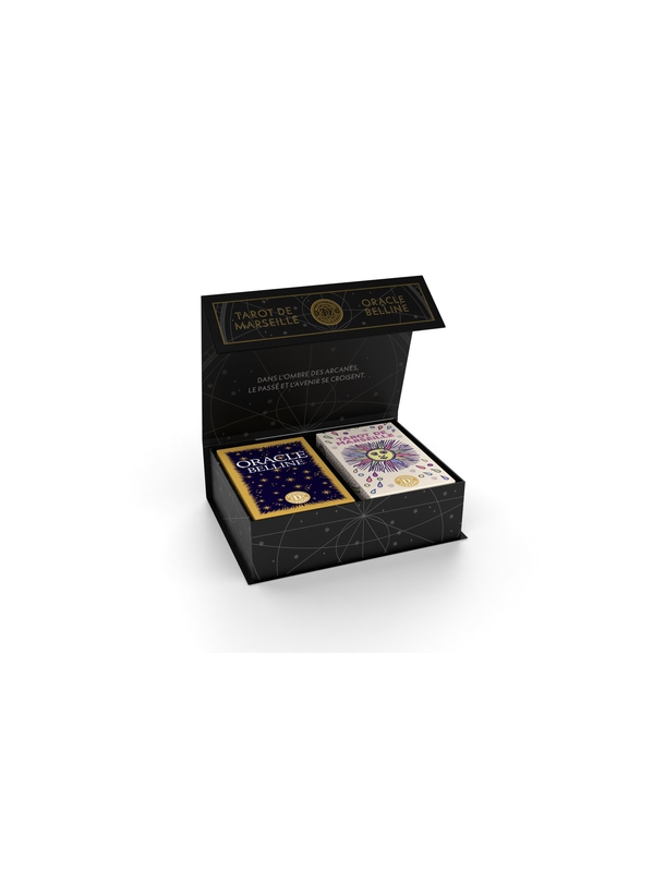 Ce coffret comprend : le tarot de Marseille de Paul Marteau recolorisé de 78 cartes au format 44 x 74 mm, l’oracle de belline de 53 cartes au format 47 x 74 mm. Ces jeux comportent une notice numérique accessible via le QR code.