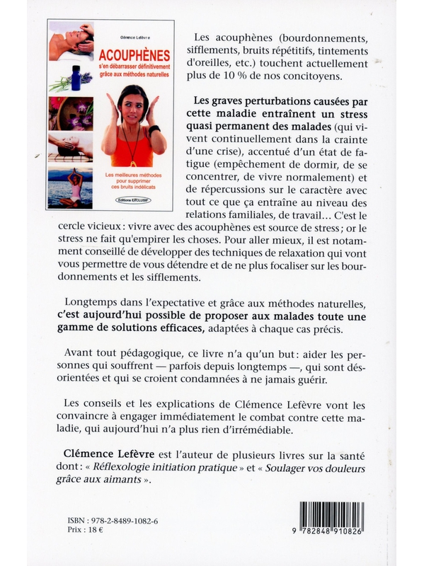 Les acouphènes (bourdonnements, sifflements, bruits répétitifs, tintements d'oreilles, etc.) touchent actuellement plus de 10 % de nos concitoyens. Les graves perturbations causées par cette maladie entraînent un stress quasi permanent des malades (qui vivent continuellement dans la crainte d'une crise), accentué d'un état de fatigue (empêchement de dormir, de se concentrer, de vivre normalement) et de répercussions sur le caractère avec tout ce que ça entraîne au niveau des relations familiales, de travail... C'est le cercle vicieux : vivre avec des acouphènes est source de stress , or le stress ne fait qu'empirer les choses. Pour aller mieux, il est notamment conseillé de développer des techniques de relaxation qui vont vous permettre de vous détendre et de ne plus focaliser sur les bourdonnements et les sifflements. Longtemps dans l'expectative et grâce aux méthodes naturelles, c'est aujourd'hui possible de proposer aux malades toute une gamme de solutions efficaces, adaptées à chaque cas précis. Avant tout pédagogique, ce livre n'a qu'un but : aider les personnes qui souffrent - parfois depuis longtemps -, qui sont désorientées et qui se croient condamnées à ne jamais guérir. Les conseils et les explications de Clémence Lefèvre vont les convaincre à engager immédiatement le combat contre cette maladie, qui aujourd'hui n'a plus rien d'irrémédiable.Lefèvre Clémence Voir moins