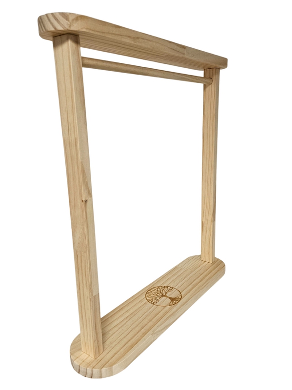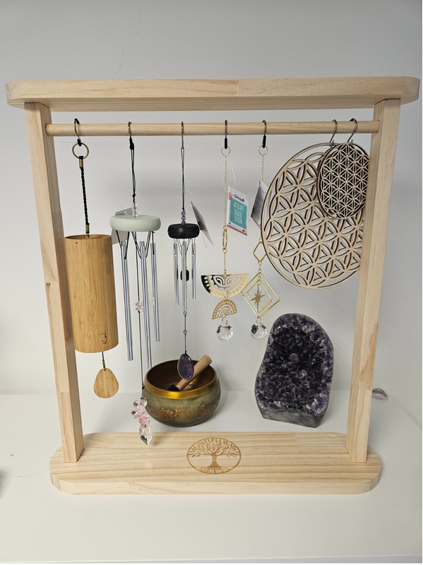 Présentoir en bois brut. Il peut accueillir plusieurs carillons . Vendu vide avec 10 crochets métalliques.