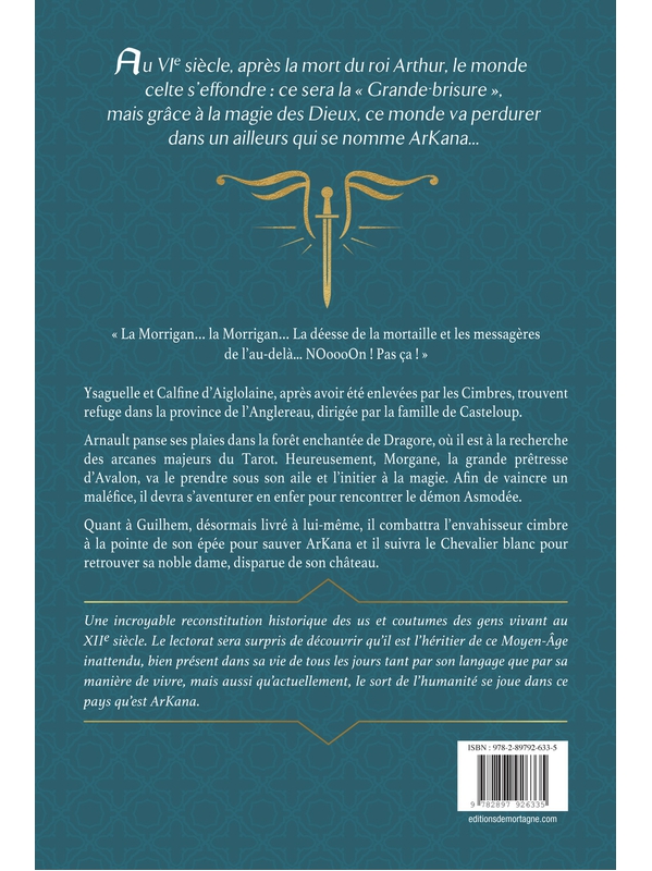 Au VIe siècle, après la mort du roi Arthur, le monde celte s’effondre : ce sera la « Grande-brisure », mais grâce à la magie des Dieux, ce monde va perdurer dans un ailleurs qui se nomme ArKana… « La Morrigan… La Morrigan… La déesse de la mortaille et les messagères de l’au-delà…NOoooON ! Pas ça ! » Ysaguelle et Calfine d’Aiglolaine, après avoir été enlevées par les Cimbres, trouvent refuge dans la province de l’Anglereau, dirigée par la famille de Castelou. Arnault panse ses plaies dans la forêt enchantée de Dragore, où il est à la recherche des arcanes majeurs du Tarot. Heureusement, Morgane, la grande prêtresse d’Avalon va le prendre sous son aile et l’initier à la magie. Afin de vaincre un maléfice, il devra s’aventurer en enfer pour rencontrer le démon Asmodée. Quant à Guilhem, désormais livré à lui-même, il combattra l’envahisseur cimbre à la pointe de son épée pour sauver ArKana et il suivra le Chevalier blanc pour retrouver sa noble dame, disparue de son château. Une incroyable reconstitution historique des us et coutumes des gens vivant au XIIe siècle. La lectrice ou le lecteur sera surpris de découvrir qu'il est l'héritier de ce Moyen Âge inattendu, bien présent dans sa vie de tous les jours tant par son langage que par sa manière de vivre, mais aussi qu'actuellement, le sort de l'humanité se joue dans ce pays qu'est ArKana.Hadar Kris Voir moins