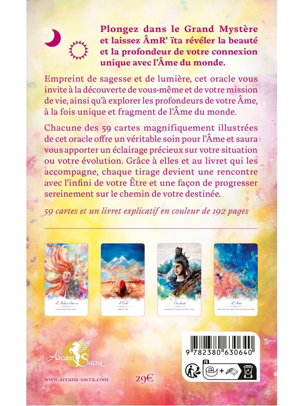 Plongez dans le Grand Mystère et laissez ÂmR’ïta révéler la beauté et la profondeur de votre connexion unique avec l’Âme du monde. Empreint de sagesse et de lumière, cet oracle vous invite à la découverte de vous-même et de votre mission de vie, ainsi qu’à explorer les profondeurs de votre Âme, à la Voir plus