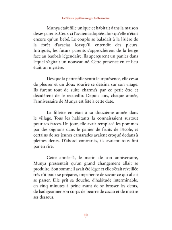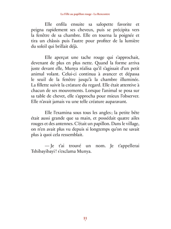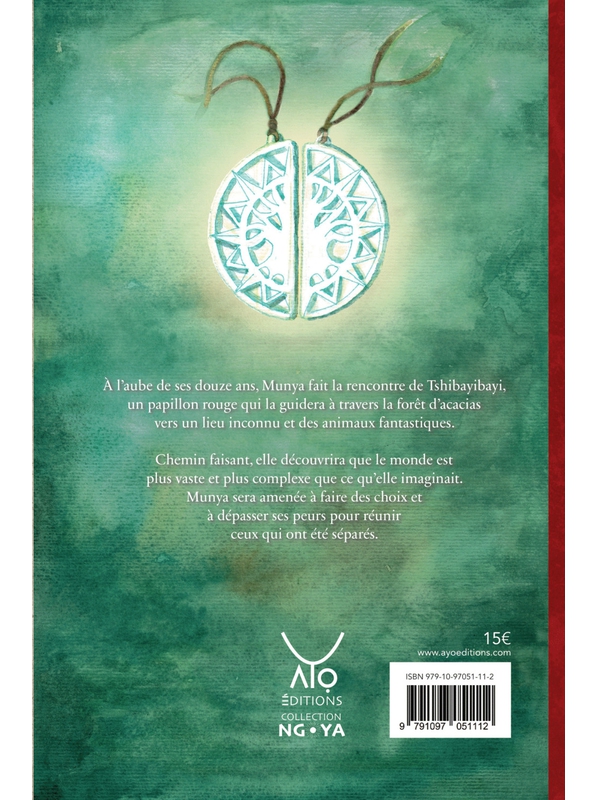 À l’aube de ses douze ans, Munya fait la rencontre de Tshibayibayi, un papillon rouge qui la guidera à travers la forêt d’acacias vers un lieu inconnu et des animaux fantastiques. Chemin faisant, elle découvrira que le monde est plus vaste et plus complexe que ce qu’elle imaginait. Munya sera amené