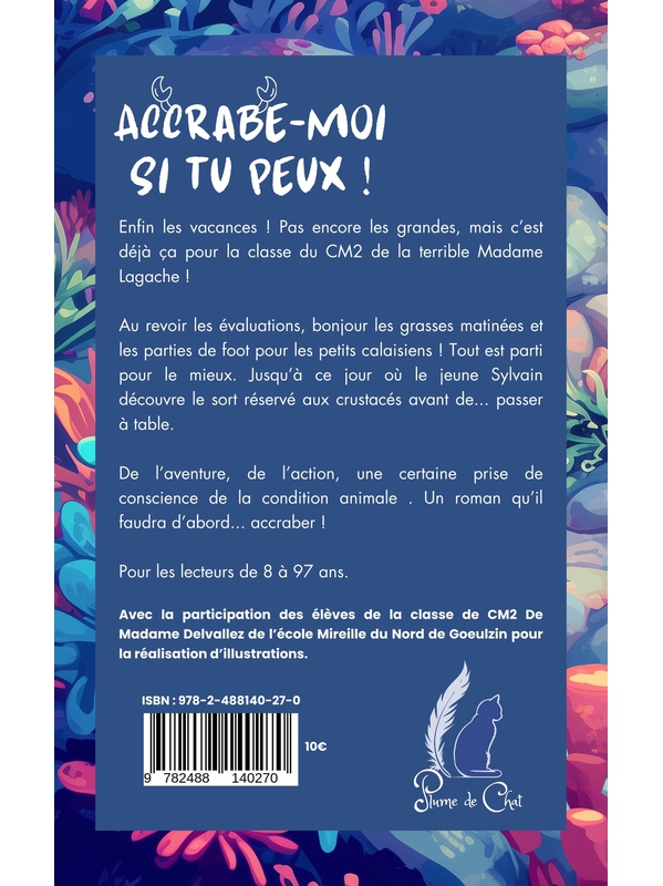 Enfin les vacances ! Pas encore les grandes, mais c’est déjà ça pour la classe du CM2 de la terrible Madame Lagache ! Au revoir les évaluations, bonjour les grasses matinées et les parties de foot pour les petits calaisiens ! Tout est parti pour le mieux. Jusqu’à ce jour où le jeune Sylvain découvre le sort réservé aux crustacés avant de... passer à table. De l’aventure, de l’action, une certaine prise de conscience de la condition animale. Un roman qu’il faudra d’abord... accraber ! Pour les lecteurs de 8 à 97 ans. Avec la participation des élèves de la classe de CM2 De Madame Delvallez de l’école Mireille du Nord de Goeulzin pour la réalisation d’illustrations.Masselot Philippe Voir moins