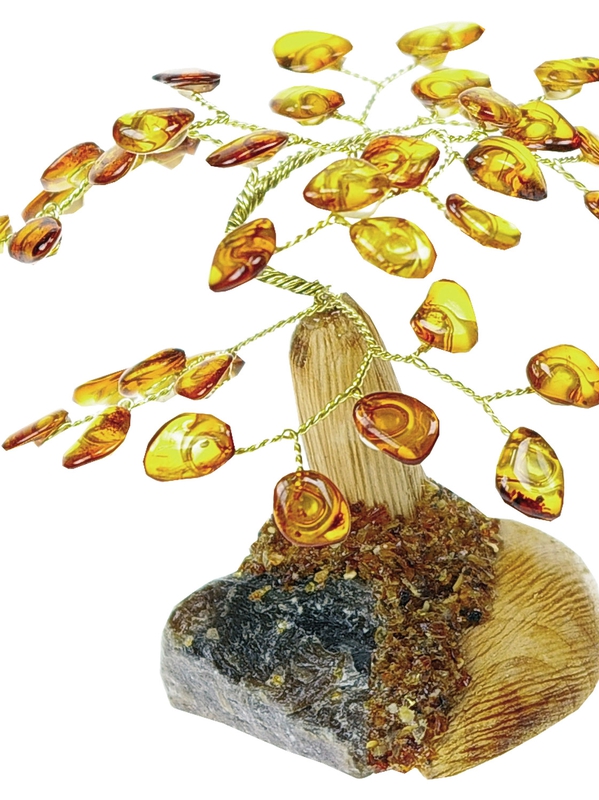 Arbre du bonheur constitué de 36 pierres d'ambre couleur cognac clair et foncé
