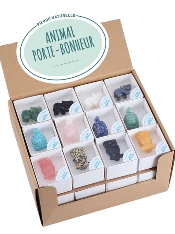 Boîte individuelle composée d'un animal Porte Bonheur en pierre soit d'Aventurine, d'Obsidienne Noire, de Cristal de roche, de Quartz Rose, de Sodalite ou d' Voir plus